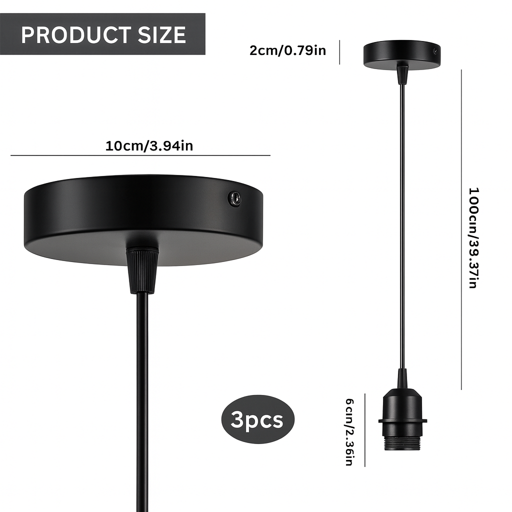 This versatile pendant base set enhances ceiling lights in living rooms, dining spaces, cafés, or studios. The iron ceiling plate and insulated cord provide safety and stability, while the E27 socket offers universal bulb compatibility.